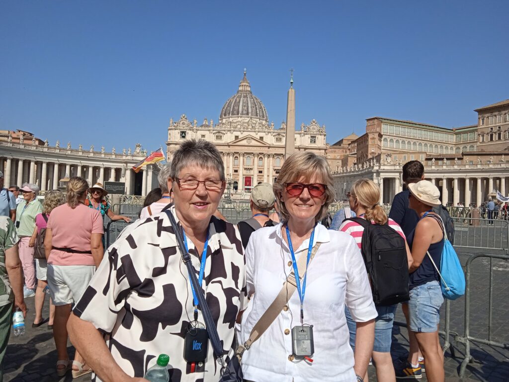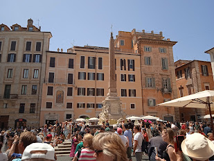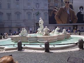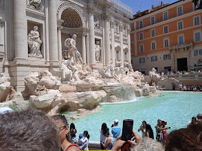 Als erstes marschierten wir durch die Innenstadt zum Vatikan. Rom war unheimlich voll und sehr warm, ca. 33 Grad. Von außen bewunderten wir die verschiedenen Bauwerke. Dann hieß es wieder in den Bus und eine kleine Stadtrundfahrt. Wieder raus in die glühende Hitze zum Kolosseum, zum Forum Romanum und dem Trevi-Brunnen. Hier gönnten wir uns ein absolut köstliches italienisches Eis. Ich löste mich schon in der Sonne auf und der Schweiß lief mir in Strömen, Angela sah noch immer elegant und frisch aus. Nach einer weiteren Viertelstunde landeten wir zu einem Mittagessen in einem ‚einheimischen‘, Touristenlokal. Gestärkt ging es weiter zur Piazza Navona mit seinen beiden schönen Brunnen.