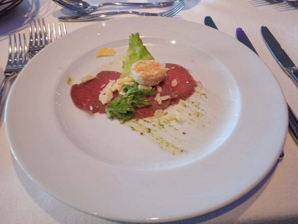 Lange mit meiner Schwägerin geplant, hieß es jetzt aufs Kreuzfahrtschiff ins westliche Mittelmeer. Am Mittwoch hatten wir uns in Hannover im Hotel Maritim am Flughafen verabredet. Angela wurde von Sohn Alfred aus Bielefeld dorthin gebracht und ich machte mich von Boizenburg auf und landete in einer Totalsperrung der Autobahn, so dass Angela vor mir im Hotel Maritim, direkt am Flugafen Hannover, eincheckte. Gut angekommen, machten wir es uns im Foyer bei einem leckeren Stück Kuchen gemütlich. Wir ließen es langsam angehen, ebenso abends bei einem leckeren Essen mit Carpaccio als Vorspeise und leckeren Spaghettinis mit Gambas als Hauptspeise und einer guten Flasche Weißwein.