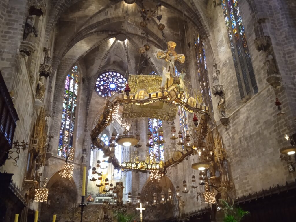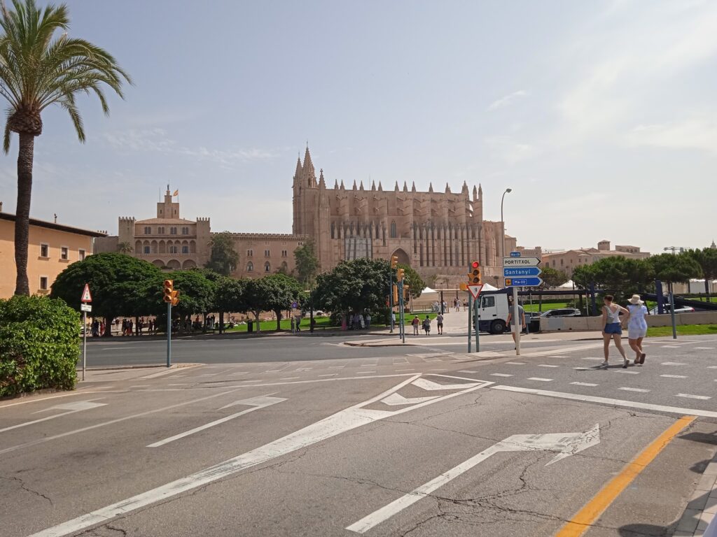 Als Zweites fahren wir zur allgemeinen Haltestelle der Shuttle-Busse. Nach wenigen Schritten erreichen wir die Innenstadt und gehen hier zur Kathedrale. Die Kathedrale der Heiligen Maria ist die Bischofskirche des Bistums Mallorca.Sie wird im Volksmund oft einfach La Seu genannt; dieser katalanische Ausdruck bedeutet „der Bischofssitz“. Die Kathedrale ist 109,50 Meter lang und 33 Meter breit, das Hauptschiff misst 75,50 Meter in der Länge und 19,50 Meter in der Breite. Die beiden Seitenschiffe sind je 86 Meter lang und 10 Meter breit. Die 14 Pfeiler, auf denen das Gewölbe ruht, sind 30 Meter hoch, das Hauptschiff erreicht 44 Meter Höhe und die beiden Seitenschiffe je 30 Meter.