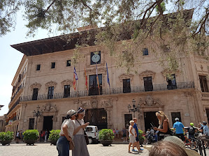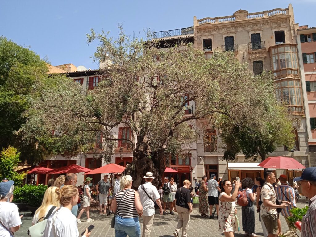 Nach gut einer Dreiviertelstunde marschieren wir mit unserem Tross durch die Stadt und machen beim alten Olivenbaum halt. Der uralte Olivenbaum bildet das grüne Zentrum in der Mitte des Platzes vor dem Rathaus von Palma. Geschätzte sechs Jahrhunderte zählt der Greis. Manche behaupten er wäre schon 1000 Jahre alt.